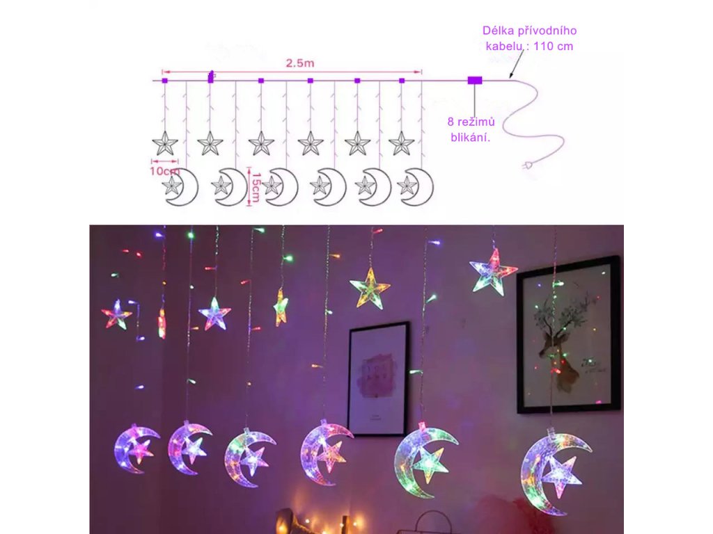 120 LED barevný řetěz se zavěšenými hvězdami a měsíci 2,5m průhledný kabel