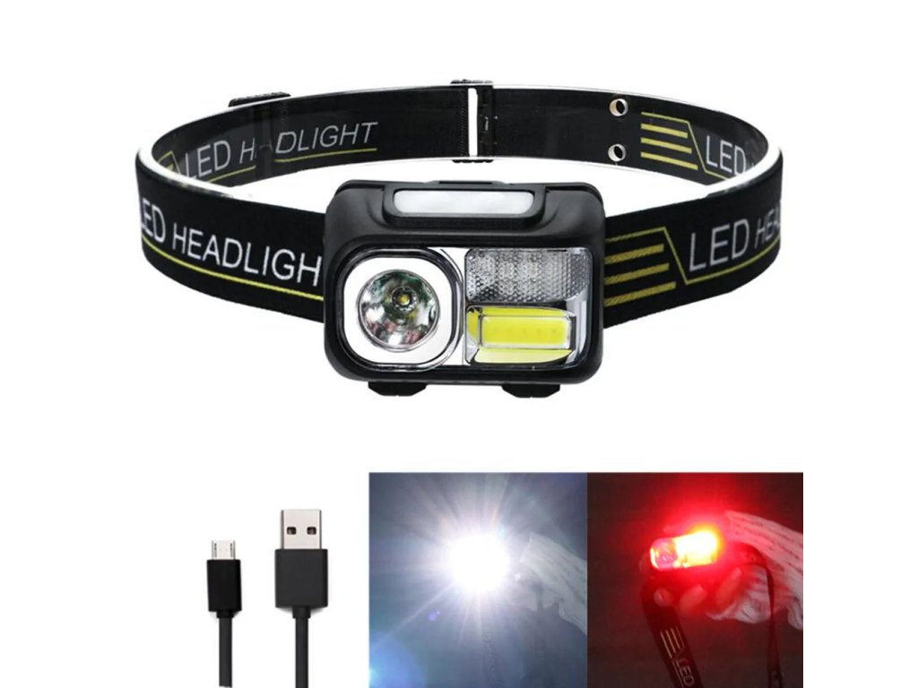 Snímací a indukční čelovka, USB dobíjecí, s vestavěnou baterií COB. Bílá / červená LED rybářská svítilna